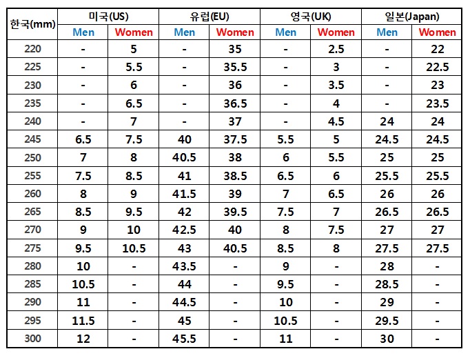 혹여나 해외에서 신발을 구매하게 된다면 참조하기 좋을 것 같아서 사이즈표 올려둡니다.