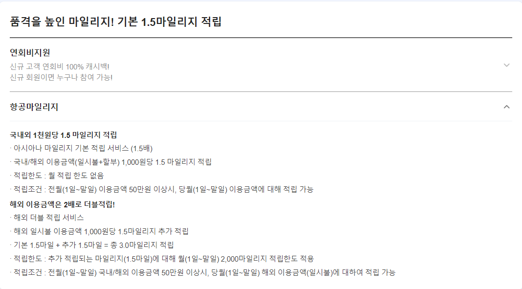 딱히 해외사용 할 일 없으니 그냥 1,000원 당 1.5마일리지 적립으로 생각. 연회비 4만 5천원.